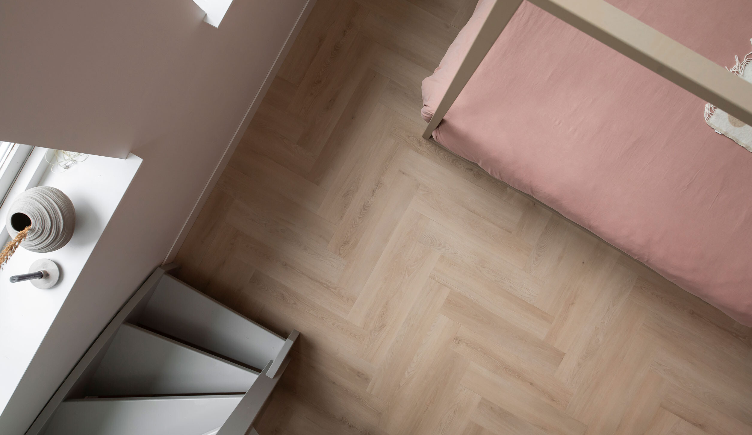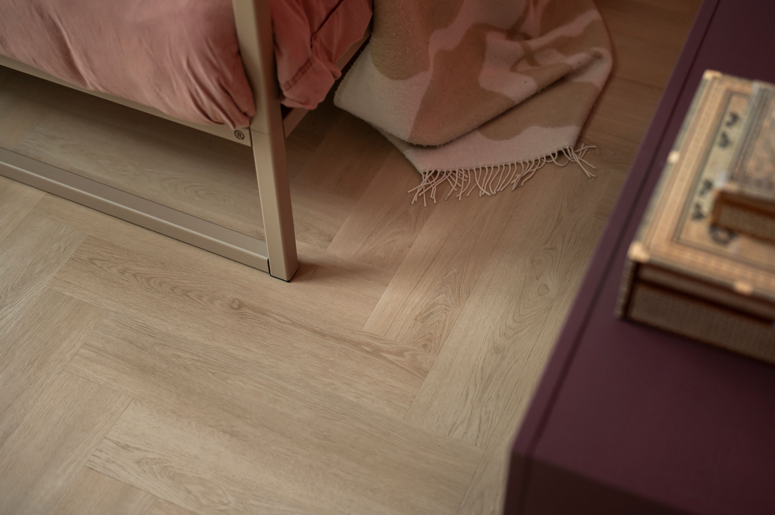 Each plank lies directly on the subfloor. There are no raised edges or slight height differences. The surface reads as a single, continuous plane, which is especially noticeable with herringbone patterns.