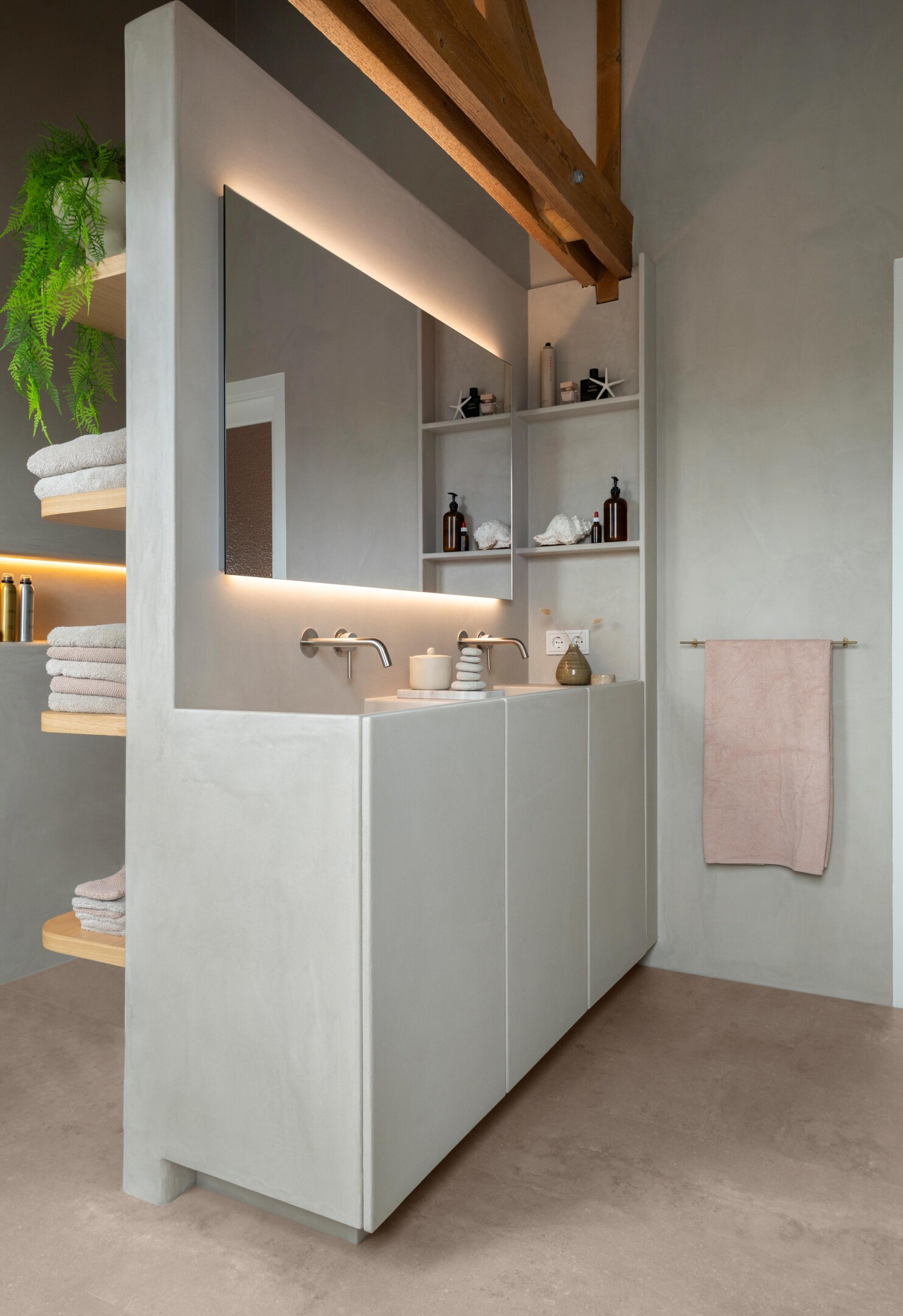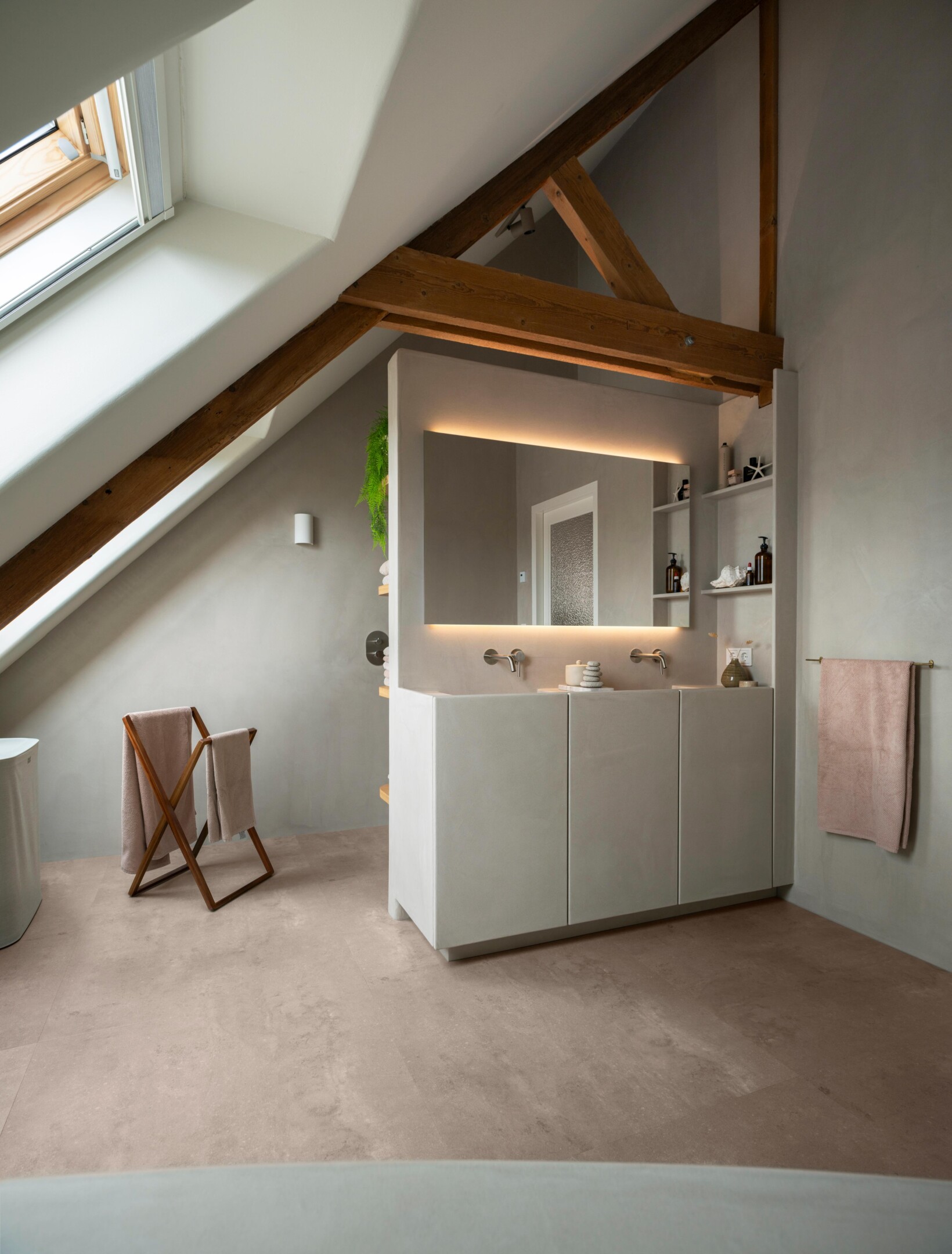 In a bathroom where the floor mainly gets damp from condensation, splashes, or wet feet, LVT remains stable and retains its color. The matte top layer softly diffuses light, giving the bathroom a calmer, more inviting feel.