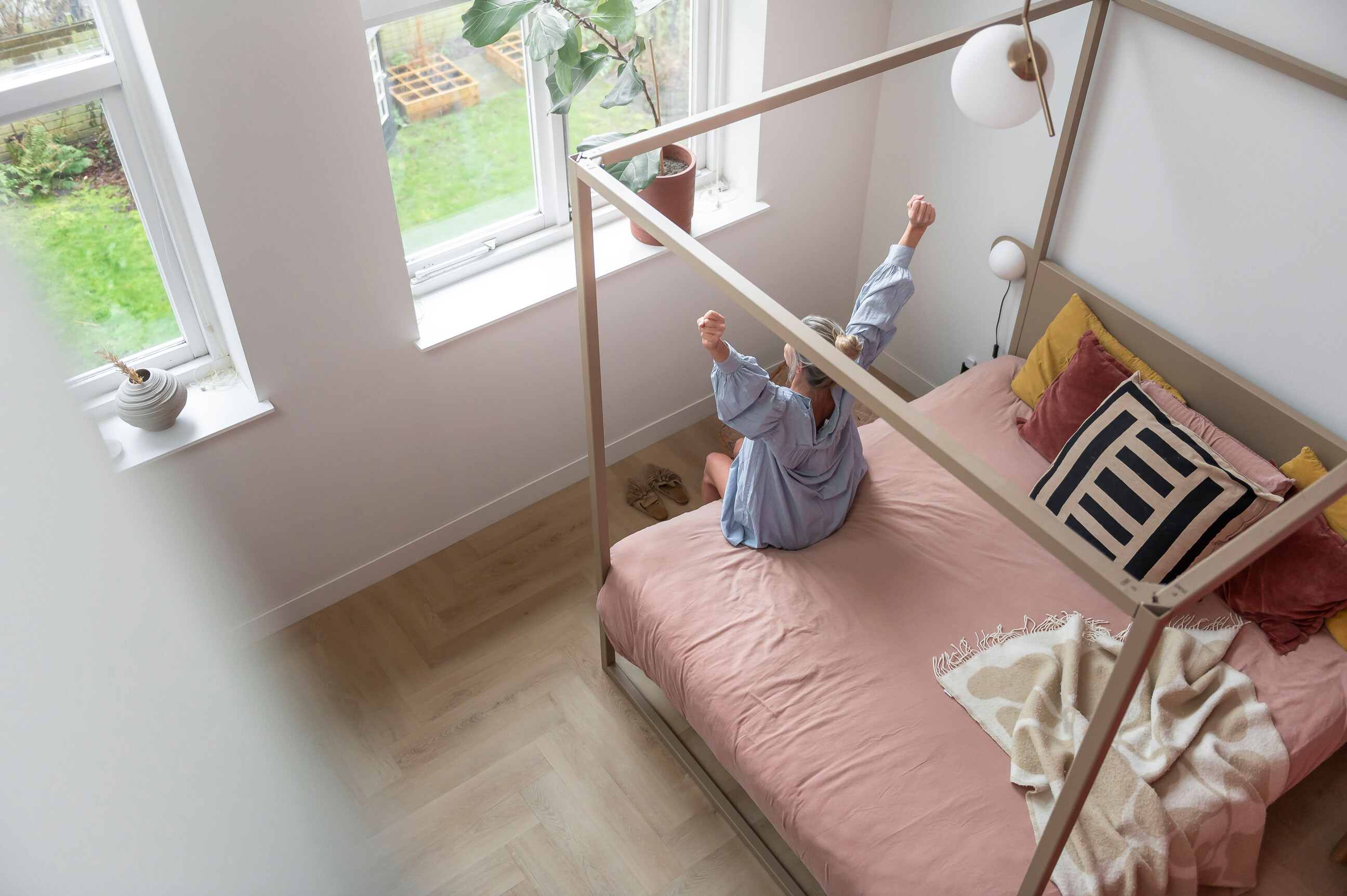 When a light-colored floor is installed, something special happens. Daylight moves more easily through the room, and the edges of the walls blur slightly, making the space feel more open. A matte texture enhances this effect. Light is softly diffused, and the floor provides a calm base that the room visually benefits from. This is especially noticeable in rooms with just one window: the light appears to extend beyond the physical space.