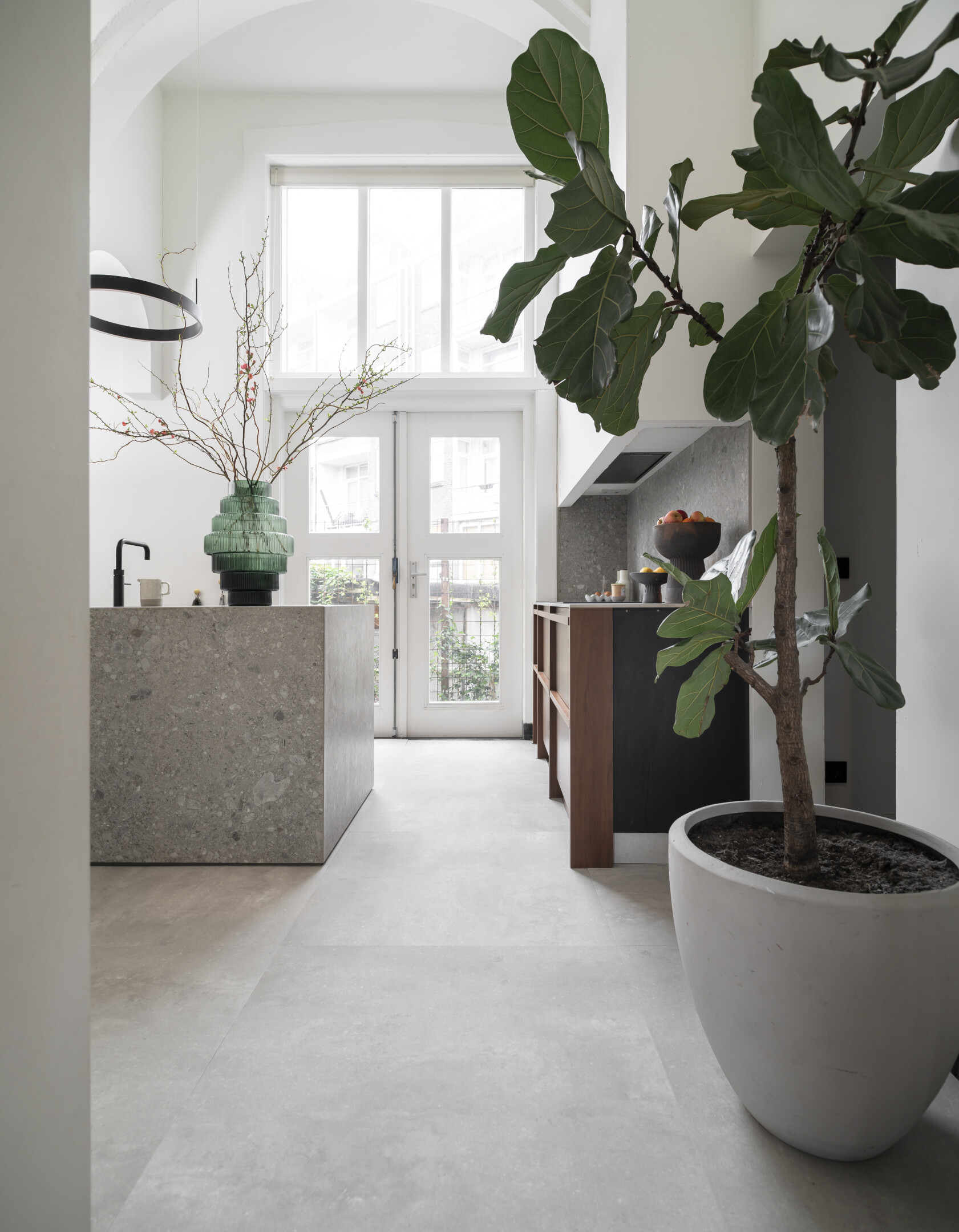 - A smooth concrete-look creates a sleek base that enhances the industrial character.