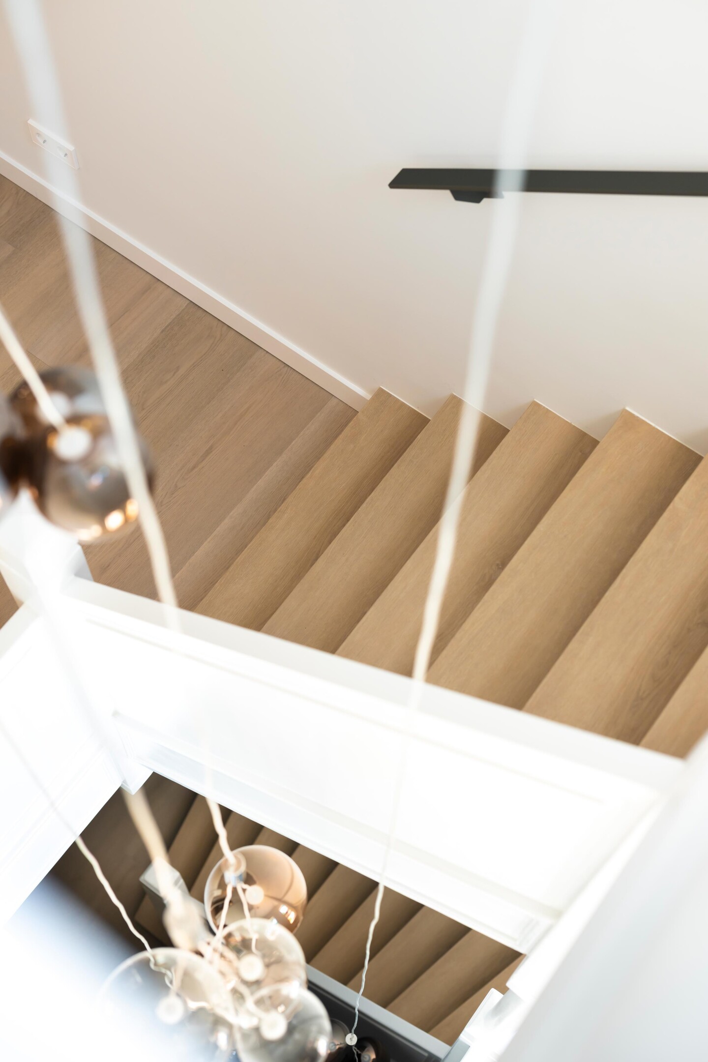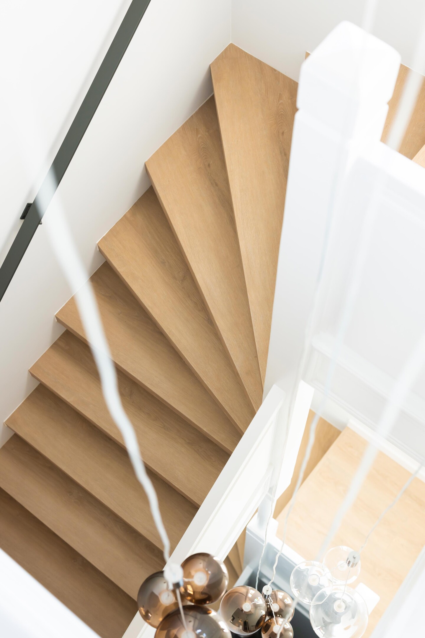 Door te kiezen voor een PVC-oplossing is deze trap niet alleen mooi, maar ook functioneel. Het oppervlak is slijtvast, geluiddempend en antislip, ideaal voor intensief gebruik in een representatieve omgeving. De voelbare houtstructuur en natuurlijke kleurschakeringen geven het geheel een warme en hoogwaardige uitstraling.
