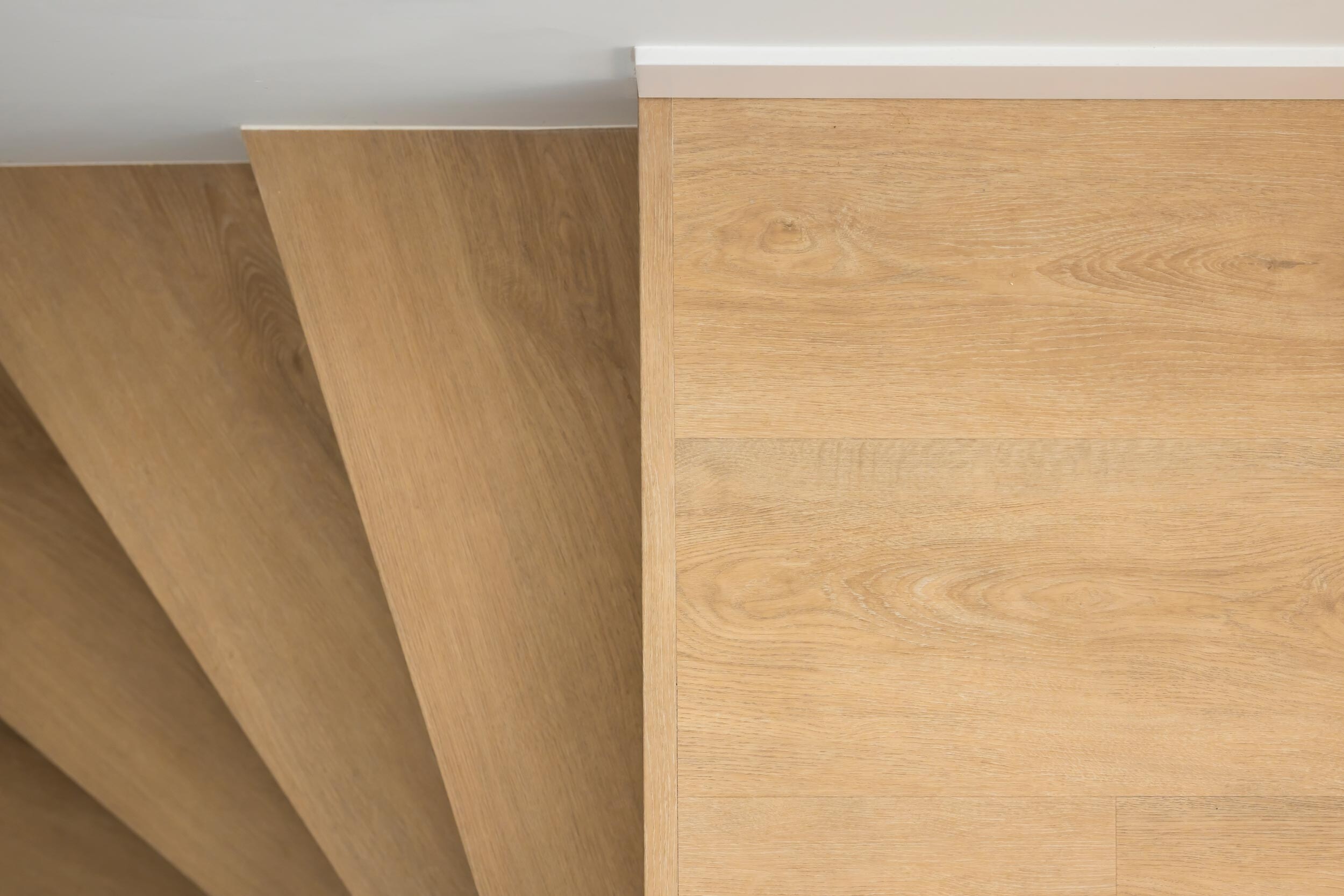 Voor de showroom van Bang & Olufsen in Katwijk realiseerde Hebeta een stijlvolle traprenovatie met de Charente XL Plank in naturel licht eiken (5446). Het gaat om een draaitrap die meerdere verdiepingen verbindt. De trap is één visueel geheel, dankzij de doorlopende afwerking in dezelfde warme houttint als de vloer.